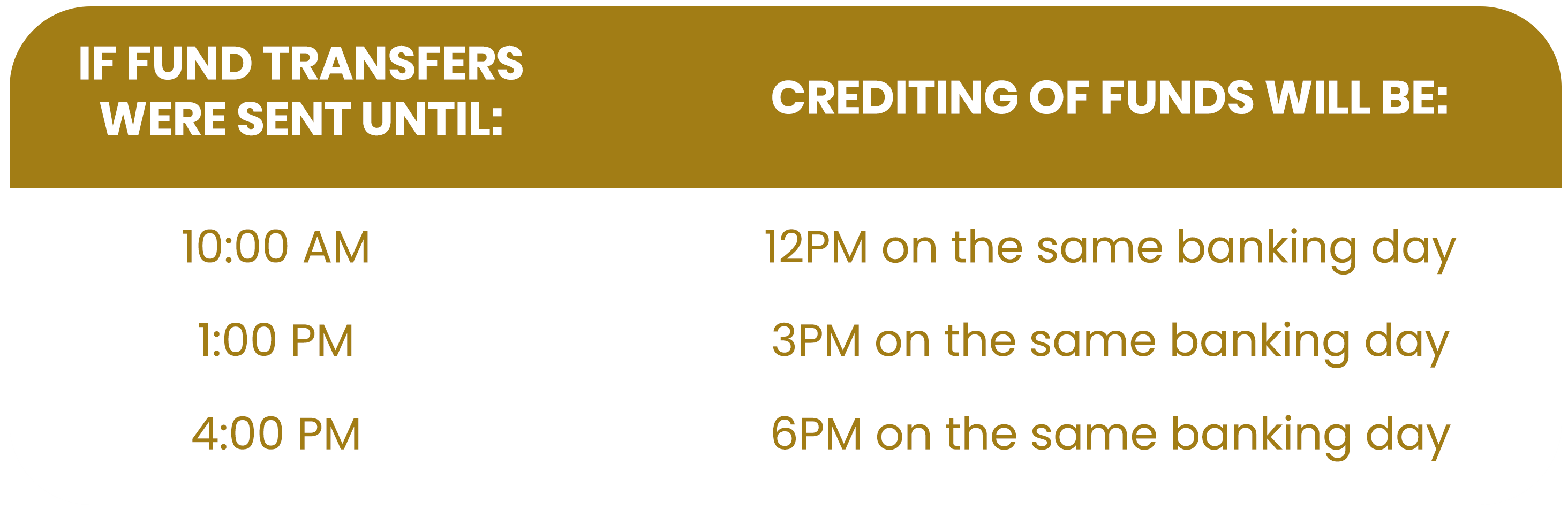 Funds you send within the cut-off period will be credited within the same banking day. For fund transfers made after the cut-off time, transaction will be credited the next banking day.